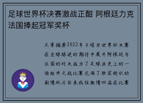 文章摘要:2022年卡塔尔世界杯决赛,在...
