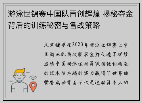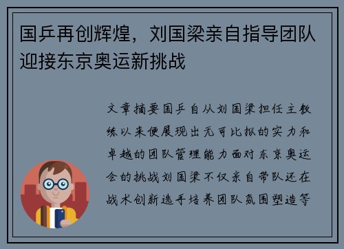 文章摘要:国乒自从刘国梁担任主教练以来,...