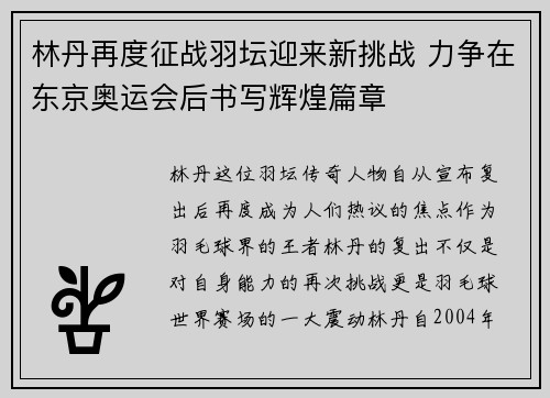 林丹,这位羽坛传奇人物,自从宣布复出后,...