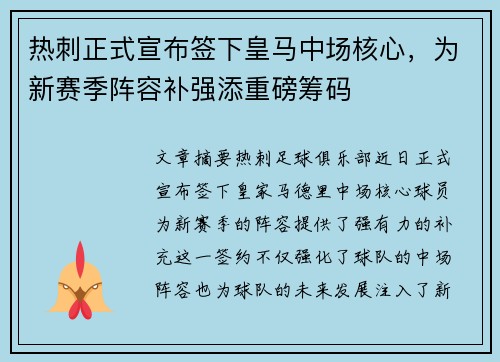 文章摘要:热刺足球俱乐部近日正式宣布签下...
