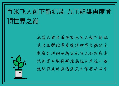 本篇文章将围绕百米飞人创下新纪录、力压群...