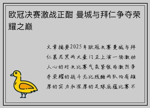 文章摘要:2025年欧冠决赛,曼城与拜仁...