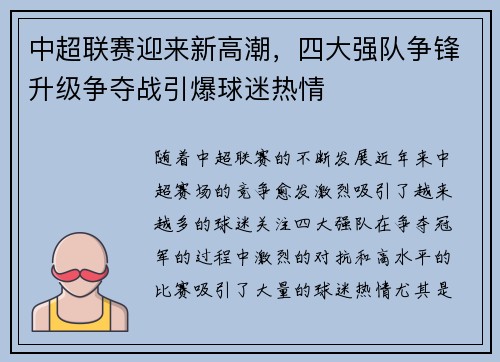 随着中超联赛的不断发展,近年来中超赛场的...