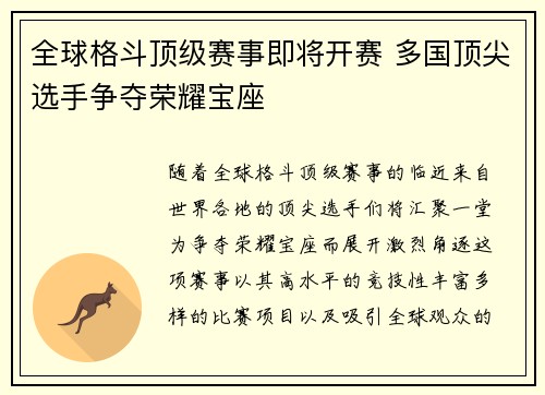 随着全球格斗顶级赛事的临近,来自世界各地...