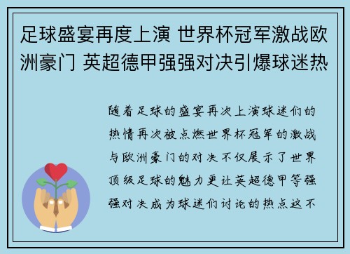 随着足球的盛宴再次上演,球迷们的热情再次...