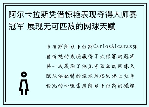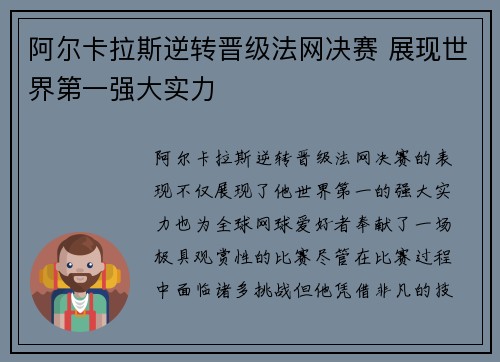 阿尔卡拉斯逆转晋级法网决赛的表现不仅展现...