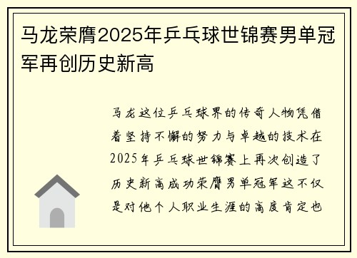马龙,这位乒乓球界的传奇人物,凭借着坚持...