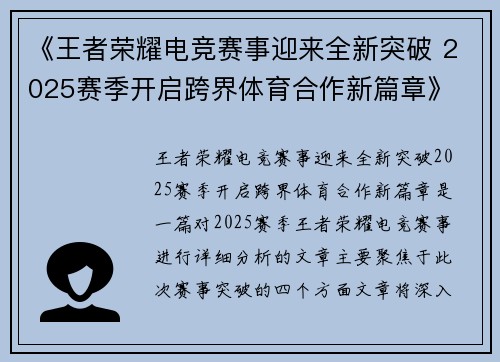 《王者荣耀电竞赛事迎来全新突破 2025...