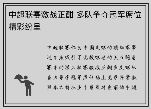 中超联赛,作为中国足球的顶级赛事,近年来...
