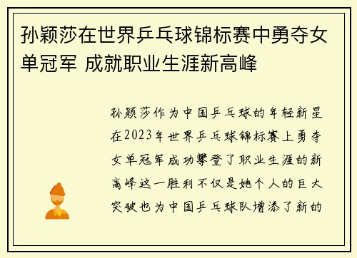孙颖莎,作为中国乒乓球的年轻新星,在20...