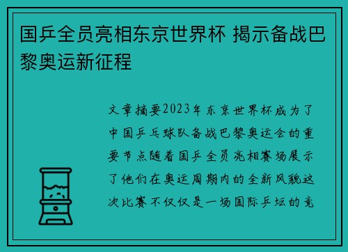 文章摘要:国乒作为世界乒坛的霸主,始终站...