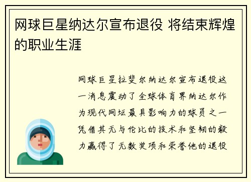网球巨星拉斐尔·纳达尔宣布退役,这一消息...