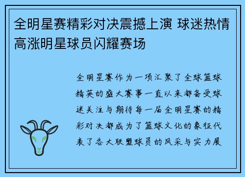 全明星赛,作为一项汇聚了全球篮球精英的盛...