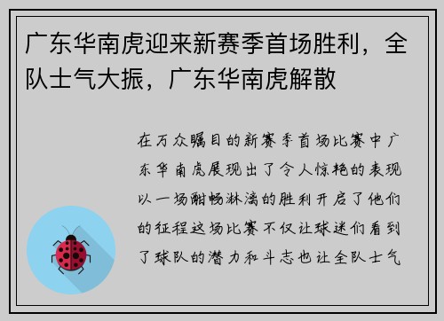 在万众瞩目的新赛季首场比赛中,广东华南虎...